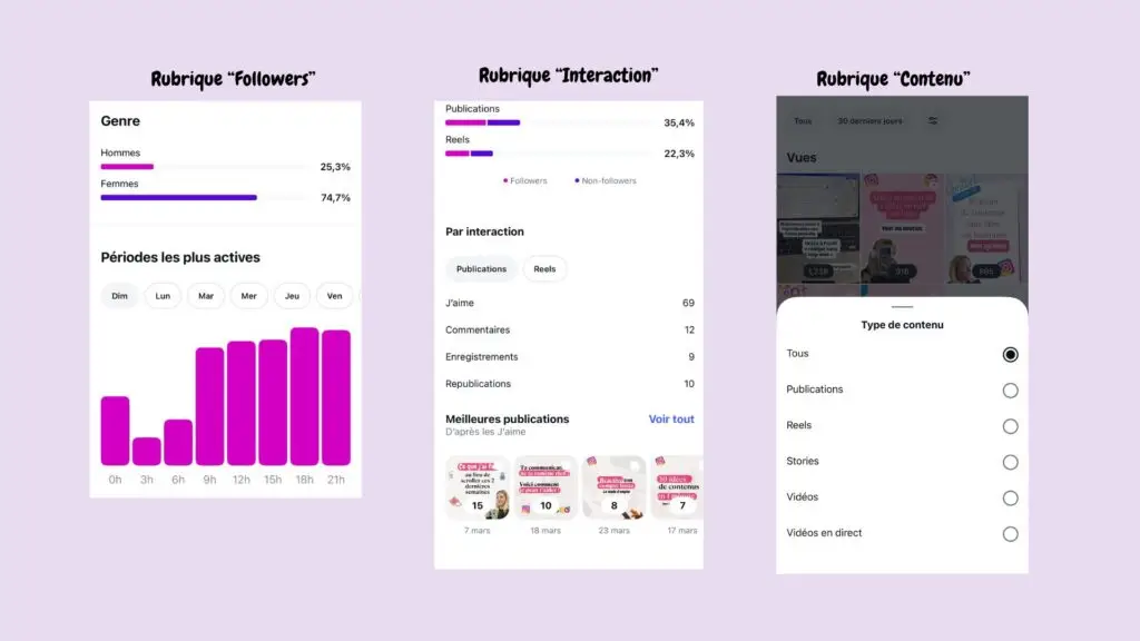 • Les posts qui génèrent le plus d’engagement (likes, commentaires, sauvegardes, partages) dans l’onglet INTERACTIONS.